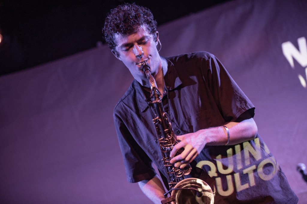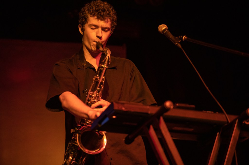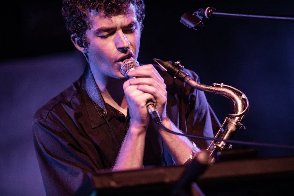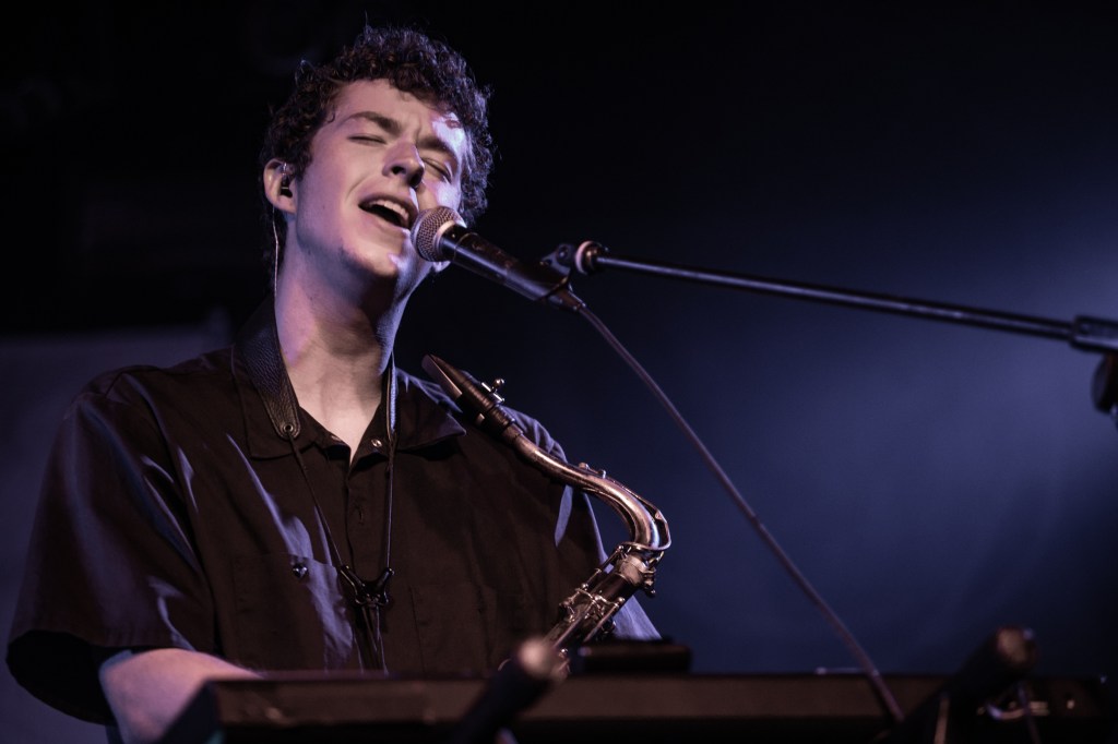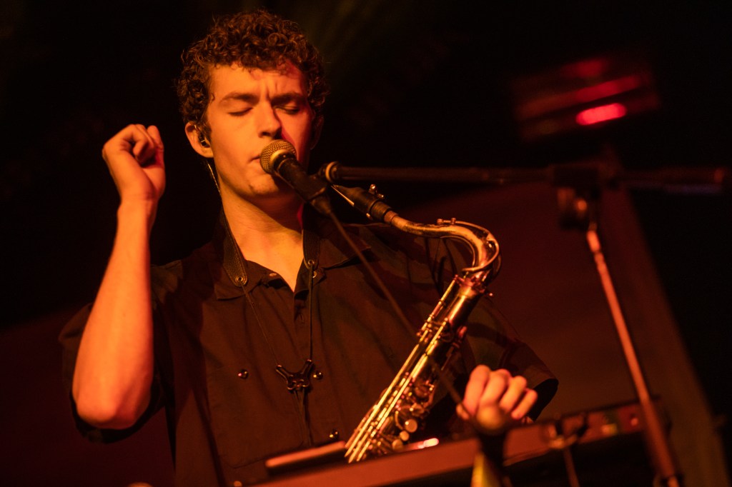 But before Knower take to the stage it’s the turn of Quinn Oulton, a multi instrumentalist who’s performing solo this evening, armed with a saxophone, a guitar and various electronics that I can’t see from so low down compared to Heaven’s high stage. His songs were interesting, with a lot of elements happening for one performer. I particularly enjoyed the saxophone elements, and the way the instrument interacted with the electronics was fascinating.