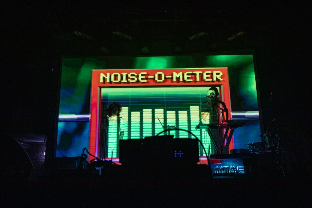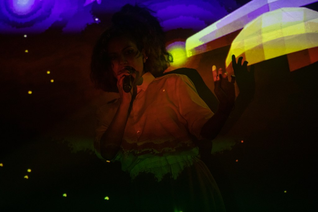 Onto the main event, Knower put on a totally unique, energetic, show. I did wonder how interesting it would be with just the two musicians but the visual element more than made up for a larger band. Right from the get go the epic entrance, complete with giant projected singing Genevieve’s faces and the tacky noiseometer, gets the whole dance floor in Heaven moving, jumping around to the catchy, bouncy, tracks. A lot of people discovered Knower through their live at home videos and performing Overtime and Time Traveller early in the set really gets things going – while Genevieve makes use of the whole stage, Louis Cole gets behind the drum kit, giving the tracks even more energy.